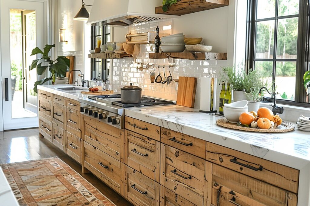 Des étagères ouvertes en bois, des chaises hautes ou même des ustensiles peuvent ajouter un élément naturel. Ces petits détails contribuent à un sentiment général de confort et de convivialité.